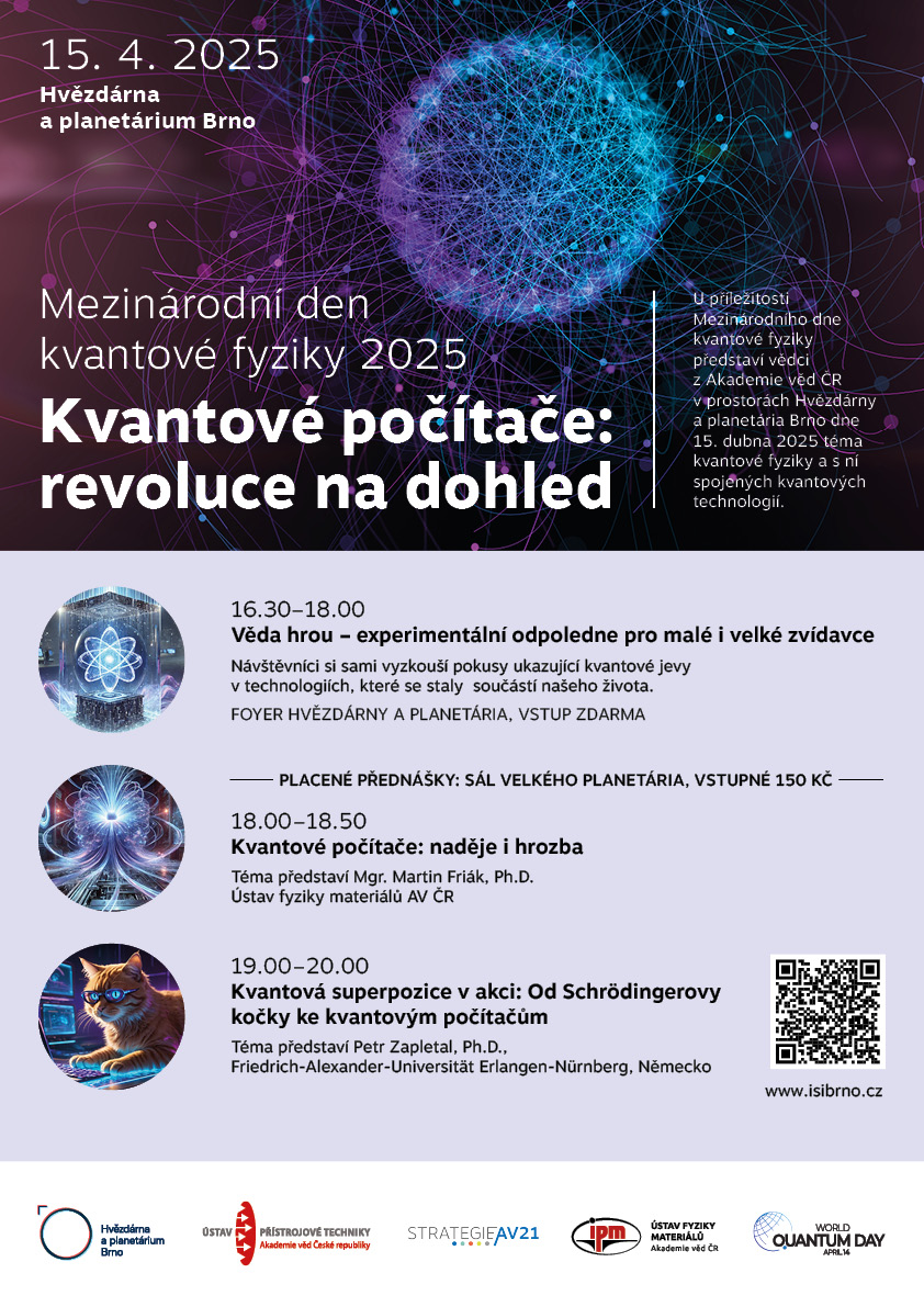U příležitosti Mezinárodního dne kvantové fyziky 2025 představí vědci z Akademie věd ČR v prostorách Hvězdárny a planetária Brno dne 15. dubna 2025 téma kvantové fyziky a s ní spojených kvantových technologií. Seznámíte se s výzkumem vědců vycházejícím z nejnovějších poznatků kvantové fyziky.